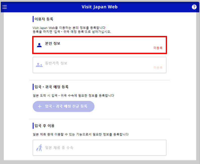 - 본인정보 또는 동반가족 정보를 모두 입력하면 미등록에서 등록으로 바뀜