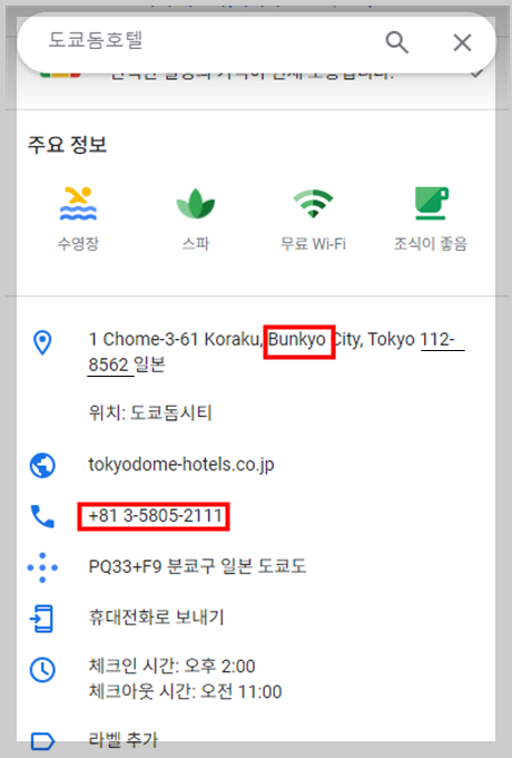 - 시구정촌명 : BUNKYO KU (본인이 묵는 호텔을 구글로 검색하면 나옴)