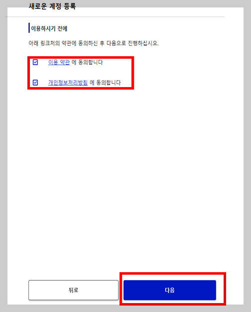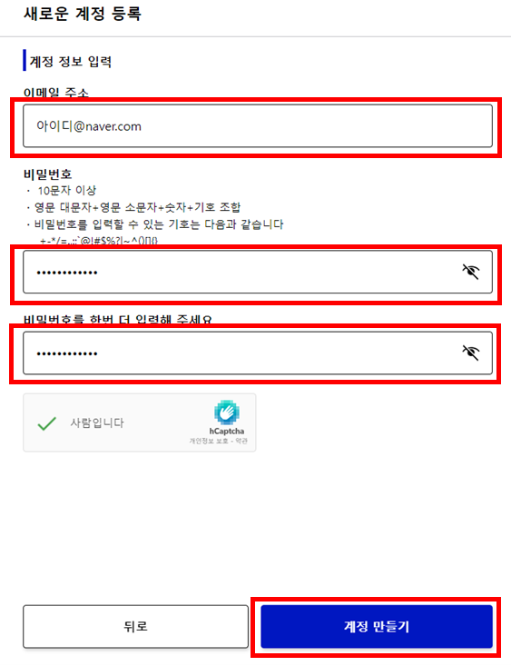 먼저 회원가입을 해줍니다. 새계정을 만들기를 누르고 약관과 개인정보 동의를 하고, 아이디와 비밀번호를 설정해줍니다.