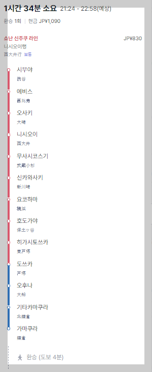 총 비용은 1,090엔으로 써 가마쿠라까지는 830엔 그리고, 가마쿠라코코마에역까진 추가로 260엔의 비용이 들어간다고 보시면 됩니다.