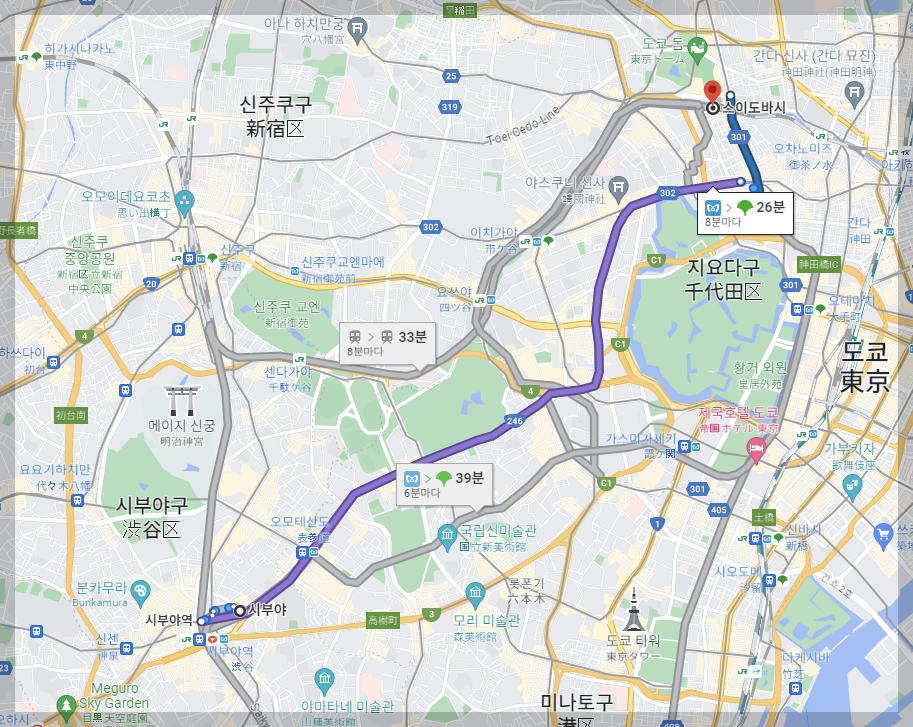 예를 들어서 목적지가 도쿄타워라고 한다면 구글 맵스의 경우 도쿄타워를 목적지로 설정하면 오나리몬역에서 내려서 750m 걸어서 이동이라고 나오는 반면, 누아메트로의 경우 출발역(스이도바시역)을 입력하고 목적지(오나리몬역)을 눌러줘야 합니다.