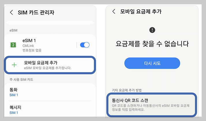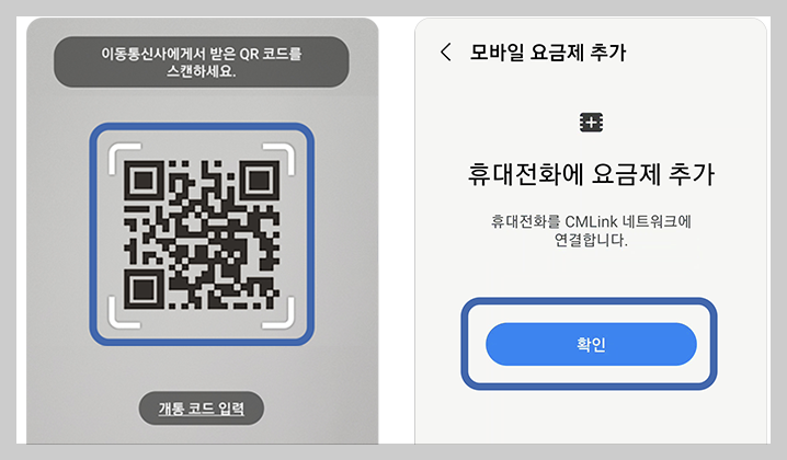 2 통신사 QR코드 스캔 선택을 합니다. 문자와 이메일로 받은 QR코드 이미지를 스캔하고 휴대전화에 요금제 추가 화면이 뜨면 '확인' 버튼을 선택합니다. 주의할점은 로딩 중에 뒤로가기 버튼을 클릭하면 안됩니다. QR코드 스캔이 안되는 경우 '개통 코드 입력'을 선택하여 수동설정을 할 수 있습니다.