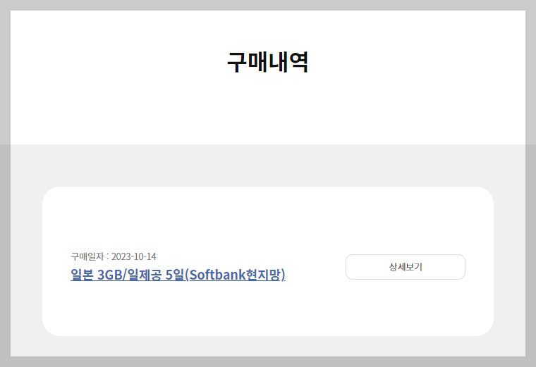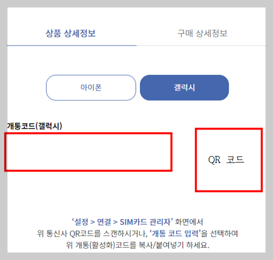 1. 홈페지에서 접속 후에 마이페이지[구매내역]에 들어갑니다. 상세보기를 눌러서 QR코드 또는 개통코드를 확인합니다.