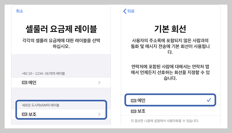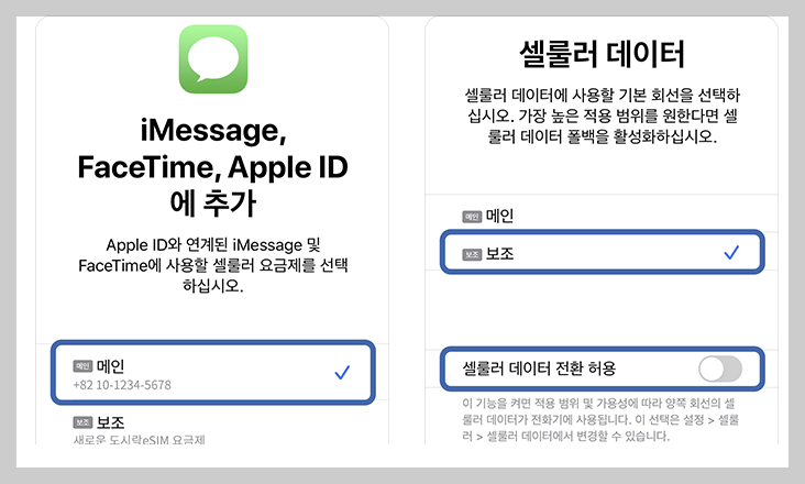 - 기본회선[기존유심 → 통화/메시지, iMassage/FaceTime / esim(현지유심) → 셀룰러 데이터(전환 허용 OFF)]