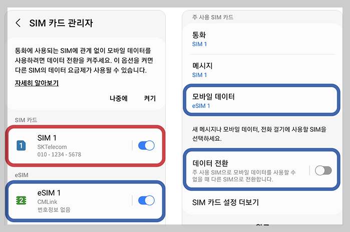 3. 설치(개통) 후 esim 사용을 위해 설정을 변경 해야 하는데 sim카드 관리자에 접속 후 아래 사진을 확인해주세요. 여기서 기존 통신사(sim)를 통해 통화, 문자 로밍 사용 가능한데 원치 않은 경우는 아래 사진에서 허용이 아닌 차단을 눌러주세요.