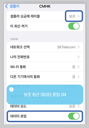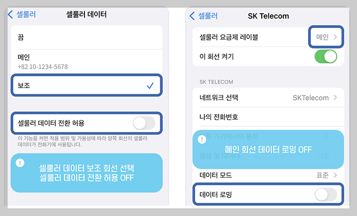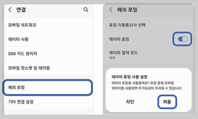 3. 데이터 전환 허용 끄기, 데이터 로밍 켜기를 눌러줍니다. 하지만 통화, 문자로밍 사용을 원치 않으면 로밍켜기를 허용하면 안됩니다.