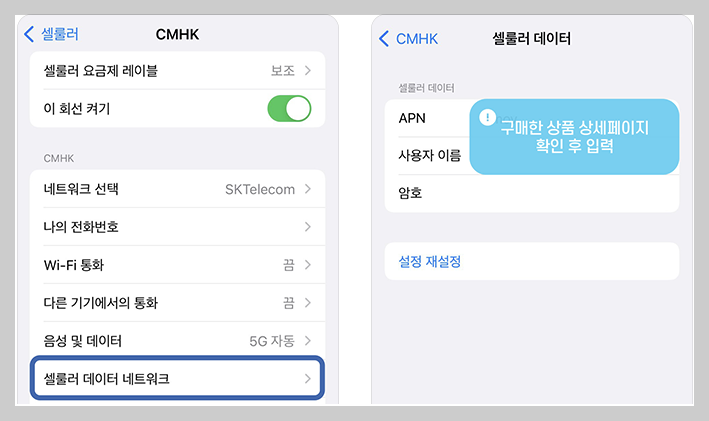 4. 만약 자동으로 연결이 안되면 설정 → 셀룰러 → 셀룰러요금제 → esim 요금제 선택 → 셀룰러 데이터 네트워크 눌러줍니다. APN을 눌러서 APN 정보를 입력을 해줍니다. ( APN 정보는 구매한 상품 상세페이지 확인)
