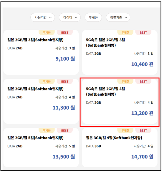 그 후에 사용일수와 데이터 제공량 등을 확인하여 본인한테 맞는 esim을 선택합니다.